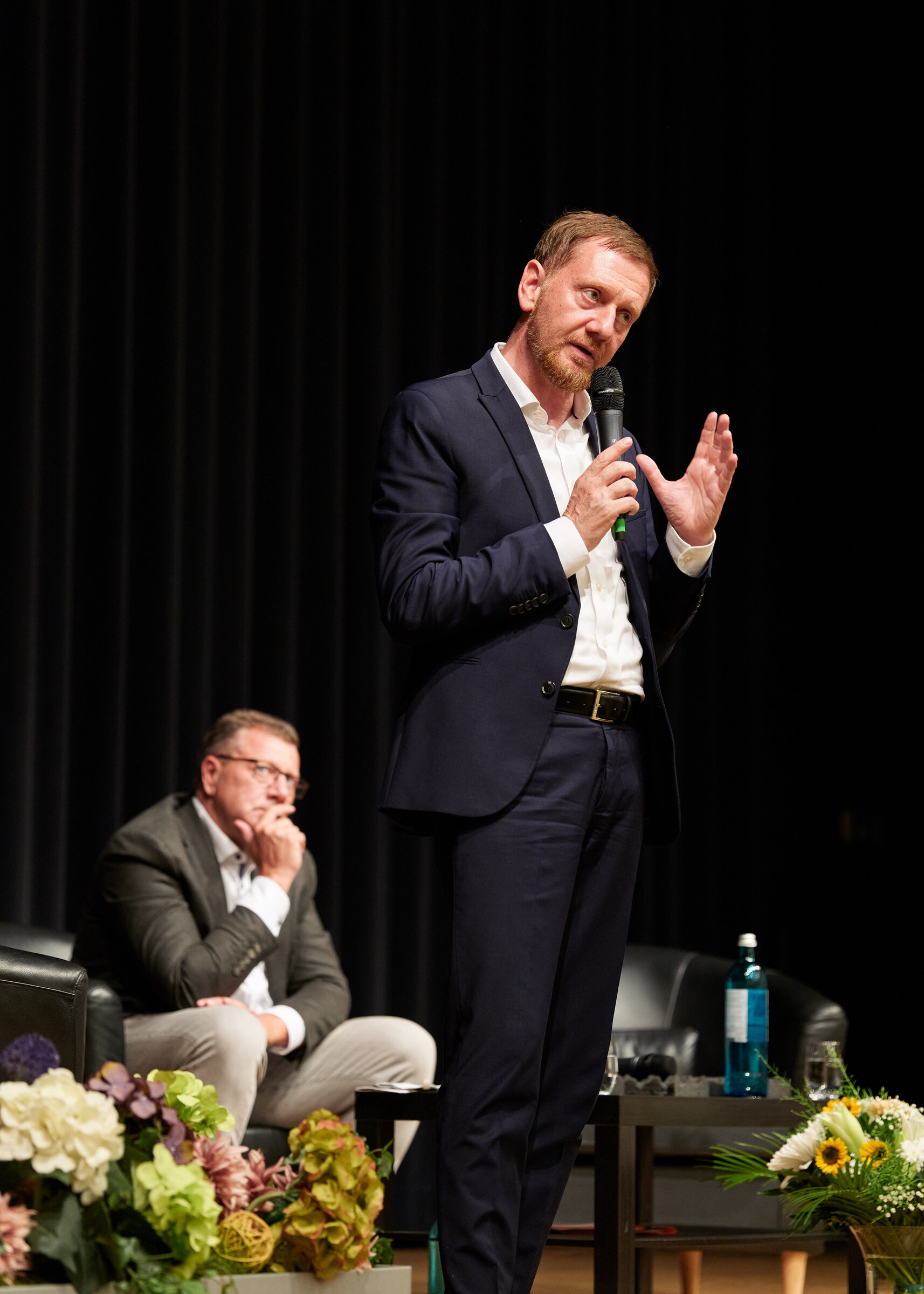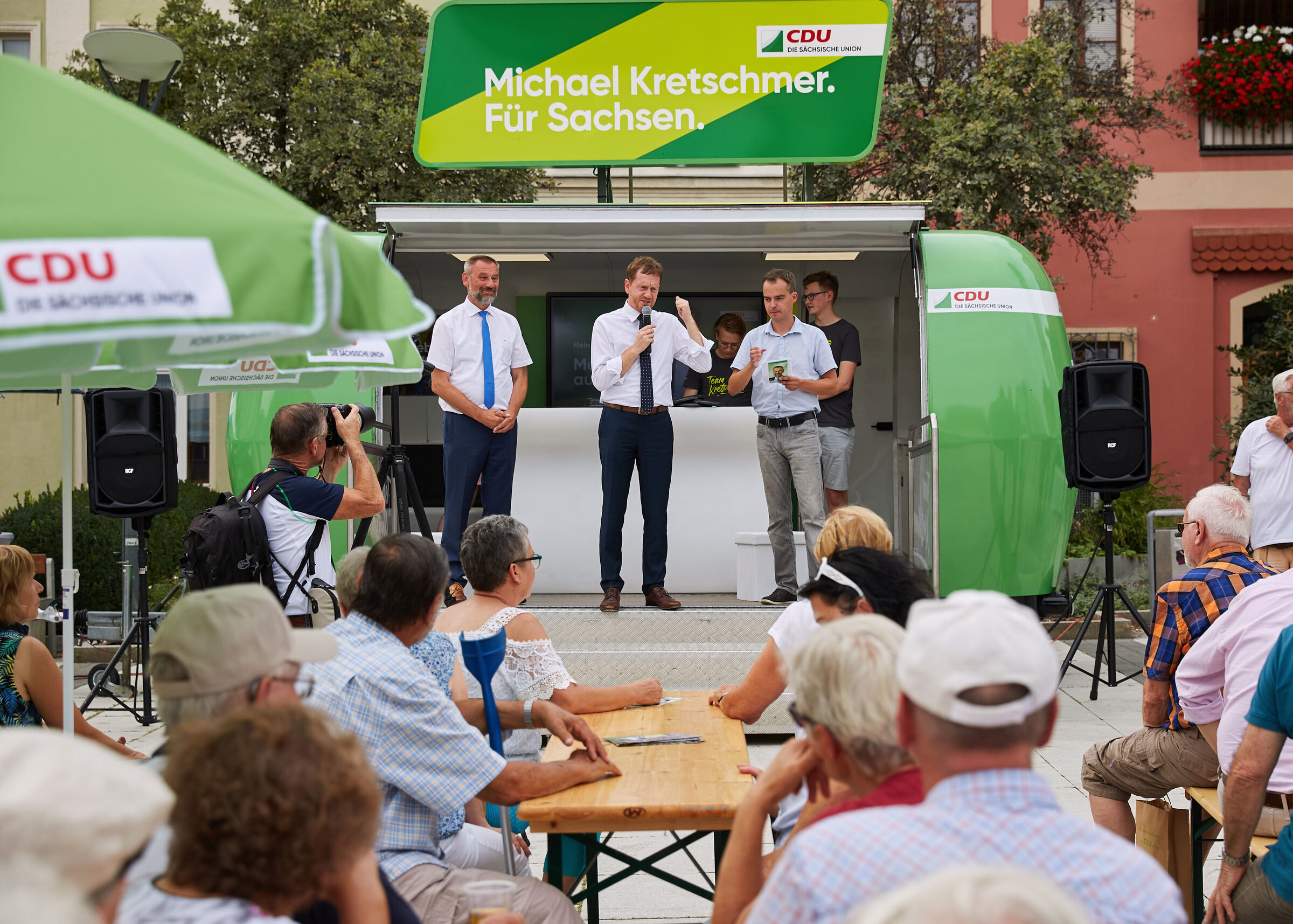 - Michael Kretschmer auf der Bühne Thomas-Müntzer-Haus in Oschatz 2024 für F.A.Z.